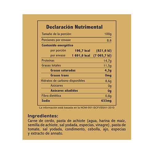 Carne de cerdo, manteca de cerdo, sal yodada, mezcla de chiles, especias, ajo y vinagre.