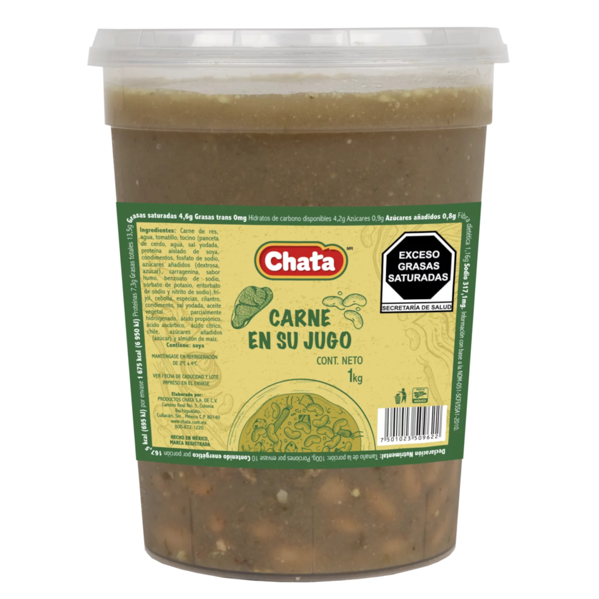 Este delicioso producto de carne en su jugo está elaborado con los mejores ingredientes, y el sabor es increíble. Contiene tocino CHATA, frijol, carne de res y el delicioso caldillo de tomatillo verde.
