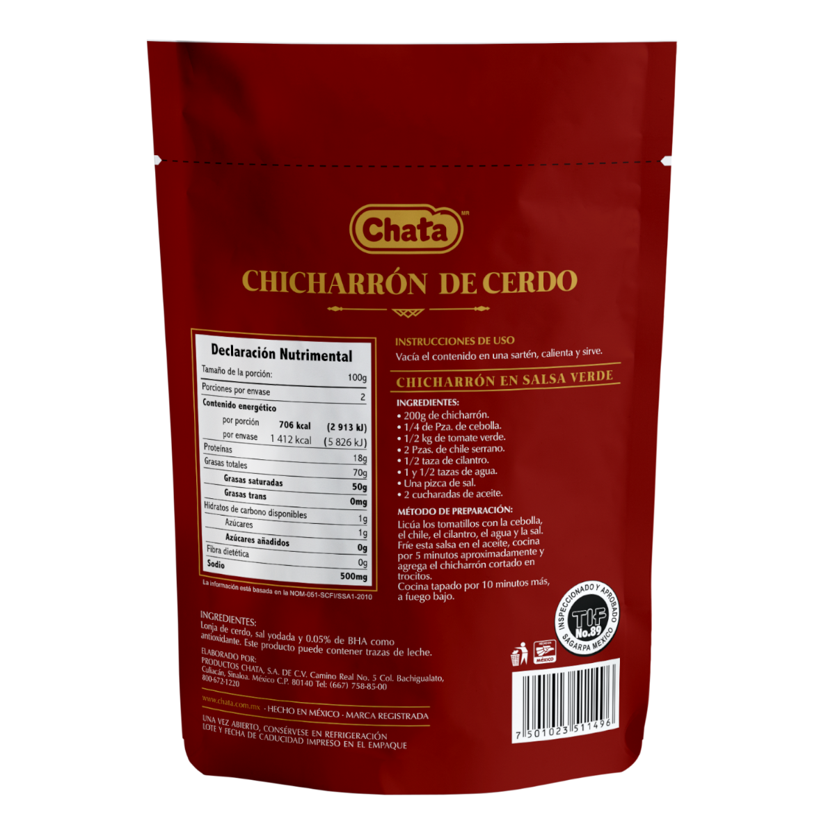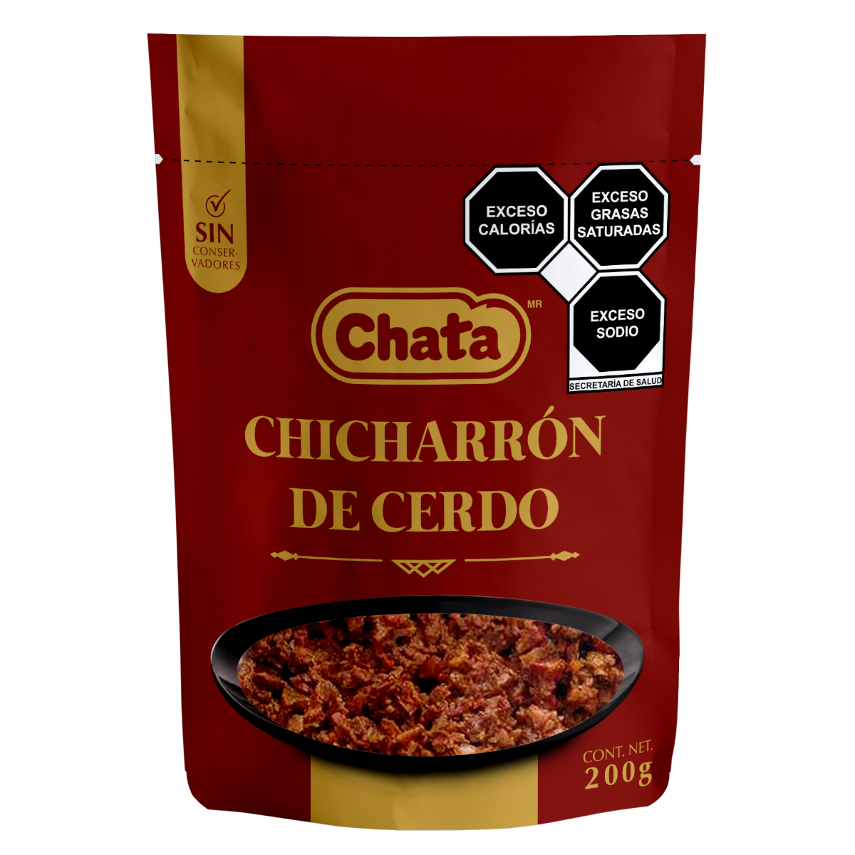 El Chicharrón de Cerdo Chata es un producto de alta calidad, perfecto para combinar con tus platillos favoritos. Ya sea con huevos al gusto, la salsa de tu preferencia o acompañado con unos deliciosos frijoles, nuestro chicharrón de 200g en bolsa añadirá un sabor auténtico a tus comidas.