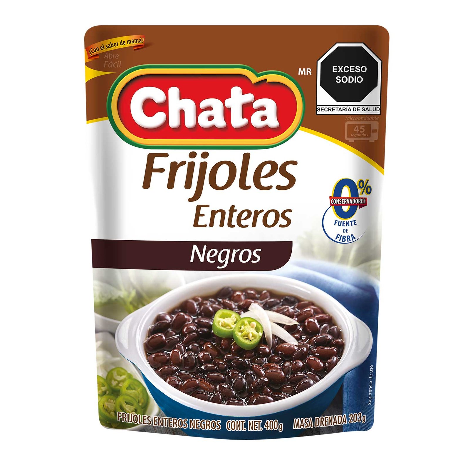 Los frijoles enteros negros Chata, son frijoles de la variedad de frijol negro cocidos con agua y un toque de sal, listos solo para calentar y consumir. Los puedes comer solos o acompañarlos con tu comida.
