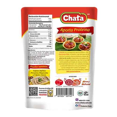 La cochinita pibil de Chata es un reflejo del sabor tradicional yucateco. Maridada con ingredientes como achiote, naranja y limón, esta delicia se presenta en un práctico pouch de 215 gramos, listo para ser el protagonista de tus platillos mexicanos.